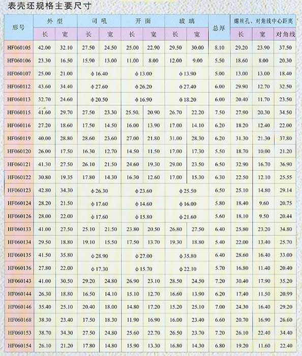 表殼坯規(guī)格主要尺