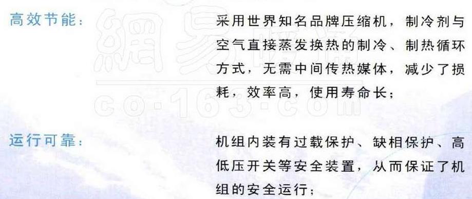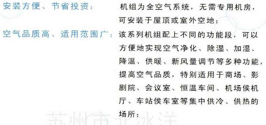 安裝方便、節(jié)省投資: 機組為全空氣系統(tǒng),無需專用機房,可安裝于屋頂或室外空地; 空氣品質高、適用范圍廣: 該系統(tǒng)機組配上不同的功能段,可以方便地實現(xiàn)空氣凈化、除濕、加濕、降溫、供暖、新風量調節(jié)等多種功能,提高空氣品質,特別適用于商場、影劇院、會議室、恒溫車間、機場侯機廳、車站侯車室等集中供冷、供熱的場所; 高效節(jié)能: 采用世界知名品牌壓縮機,制冷劑與空氣直接蒸發(fā)換熱的制冷、制熱循環(huán)方式,無需中間傳熱媒體,減少了損耗,效率高,使用壽命長; 運行可靠: 機組內(nèi)裝有過載保護、缺相保護、高低低壓開關等安全裝置,從而保護了機組的安全運