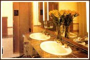理石臺面、整面鏡子使整個空間視野開闊,黃玫瑰突出溫馨、浪漫。