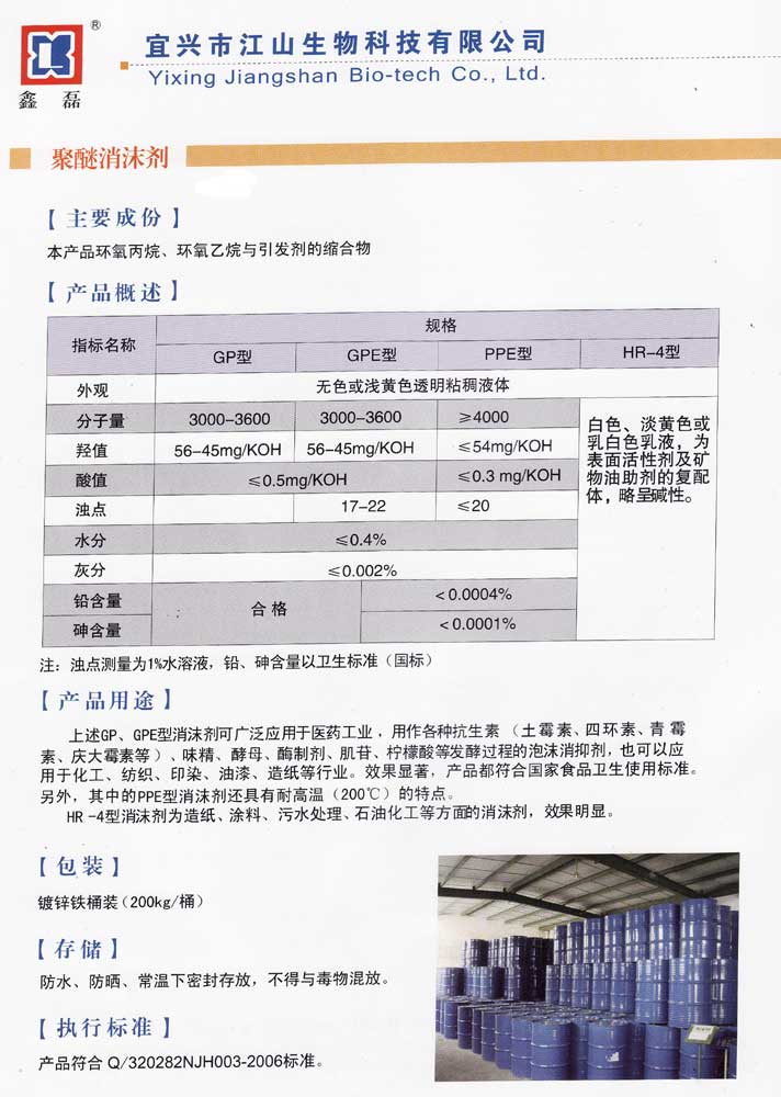 上述GP、GPE型消沫劑可廣泛應(yīng)用于醫(yī)藥工業(yè),各種抗生素(土霉素、四環(huán)素、青霉素、慶大霉素等)、味精、酵母、酶制劑、肌苷、檸檬酸等發(fā)酵過程的泡沫消抑劑,也可以應(yīng)用于化工、紡織、印染、油漆、造紙等行業(yè)。效果顯著,產(chǎn)品都符合國家衛(wèi)生食品標(biāo)準(zhǔn)。另外,其中的PPE型消沫劑還具有耐高溫(200 )的特點。