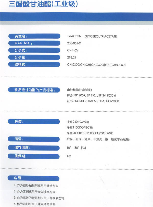產(chǎn)品名稱:三醋酸甘油酯(工業(yè)級(jí))